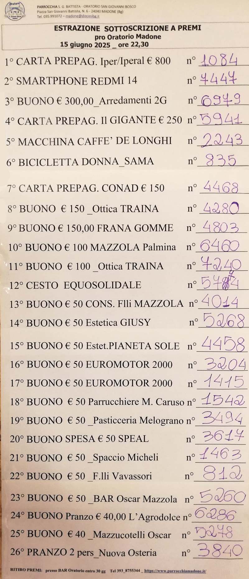 E' stata pubblicata la lista dei Biglietti Vincenti della lotteria della Festa dell'Oratorio che si è svolta dal 5 al 15 giugno. Il 1° premio, ovvero la Carta Prepagata da 800€ - IPER/IPERAL, è andata al possessore del Biglietto n°1084; Il secondo (Smartphone "REDMI NOTE 14") è stato vinto dal n°7447, mentre il terzo (Buono 300€ "Arredamenti 2G") se l'è aggiudicato il n°6979. Per conoscere tutti gli altri tagliandi estratti, abbinati ai 26 premi in palio, potete consultare o stampare la seguente LISTA in formato PDF o visionare la fotografia in basso. I premi si possono ritirare la sera stessa dell'estrazione, oppure entro 30 giorni durante gli orari di apertura del bar.